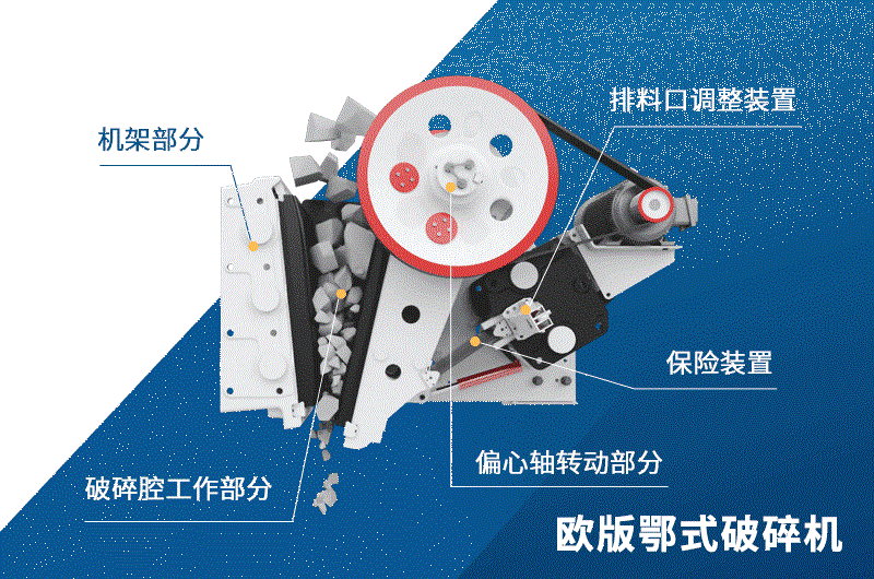 顎式破碎機主要由機架、工作機構(gòu)、傳動機構(gòu)、調(diào)節(jié)裝置、拉緊裝置,保險裝置和潤滑系統(tǒng)組成: